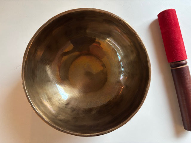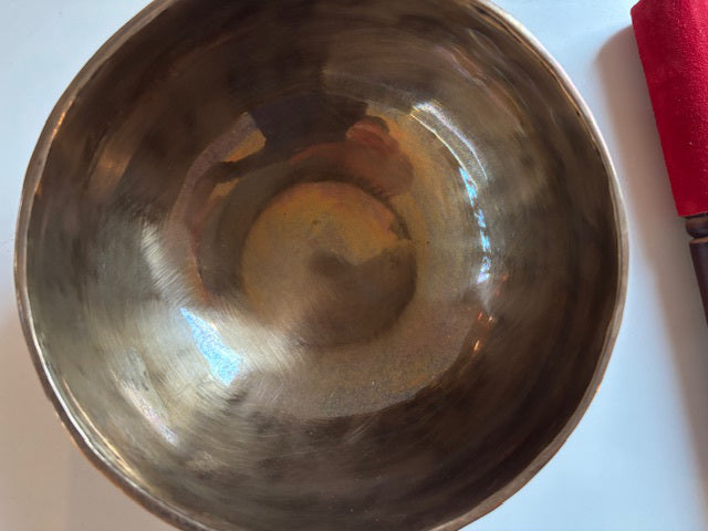 Bol tibétain de 613 grammes. 15 cm de diamètre. Note: FA. Idéal pour commencer une séance de yoga, de méditation. Son aigu. Hautes fréquences vibratoires qui agissent sur le haut du corps. Livré avec un maillet.